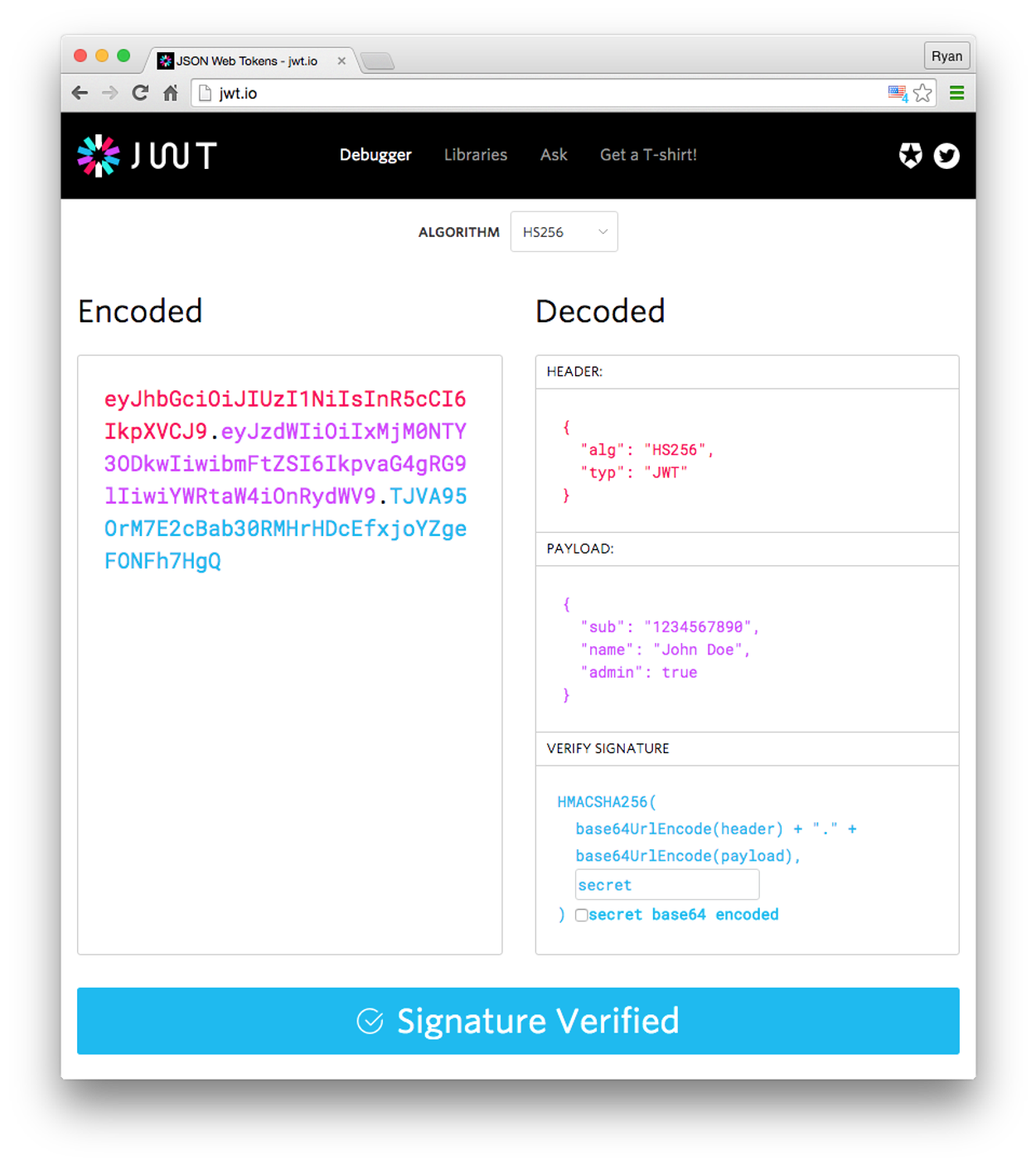 서버의 secret key를 사용하여 base64 url로 인코딩한 헤더와 페이로드를 규정된 해시 알고리즘으로 서명합니다.