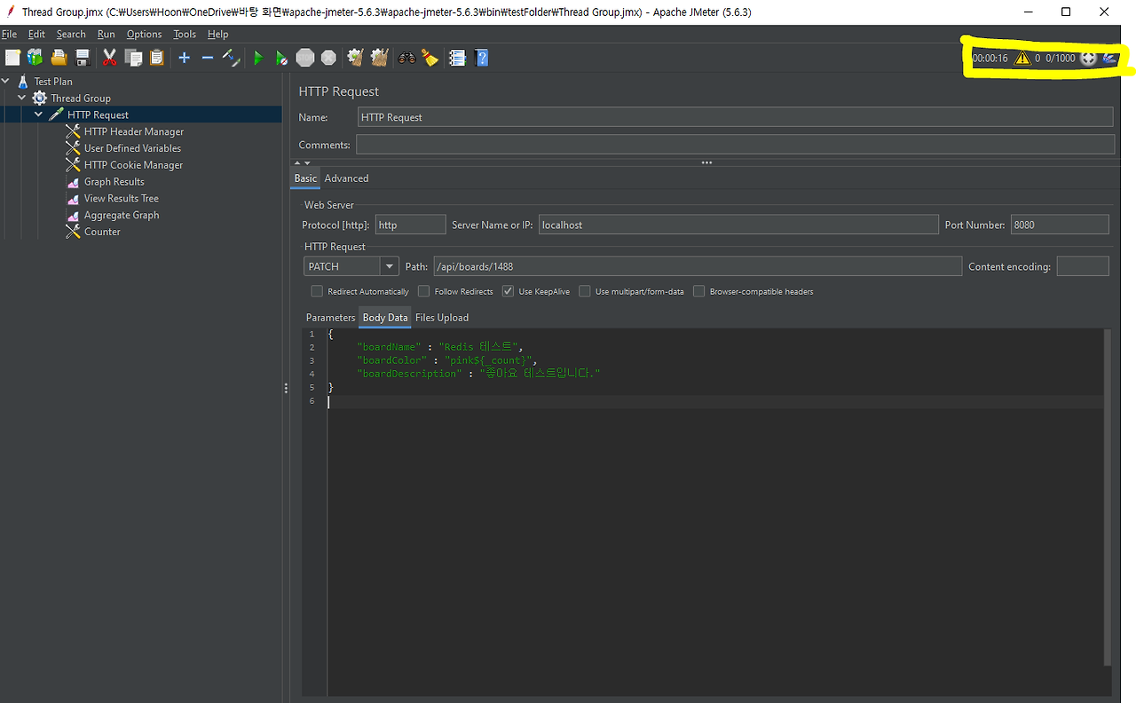 저희 팀원들과 아래의 컬리 블로그를 참고하면서 1488번의 board를 짧은 시간 내에 1000번의 좋아요를 누르게 된다면, 1000개가 제대로 반영이 될지 jMeter를 사용해 테스트를 진행했습니다.