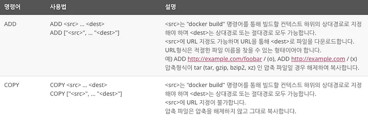 - ADD: 파일이나 디렉토리 등을 복사하여 이미지 파일시스템에 추가합니다.