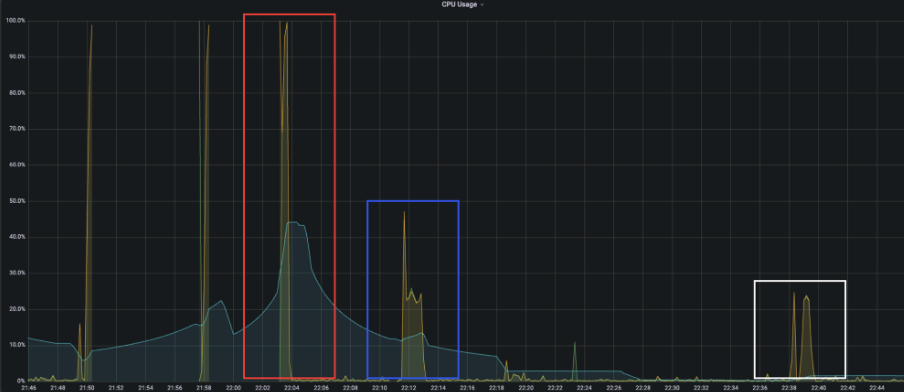 - 빨간박스 안에 있는 그래프는 한 번에 데이터를 전송 했을 때, 파란색박스 안에 있는 그래프는 배치를 사용하여 데이터를 전송 했을 때 그래프.