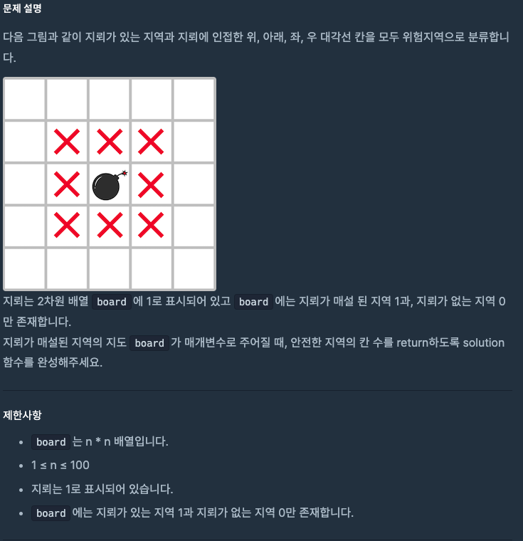 for문을 이용해 폭탄의 위치를 탐색하여, 위치에서 각 위험 지역을 체크합니다.