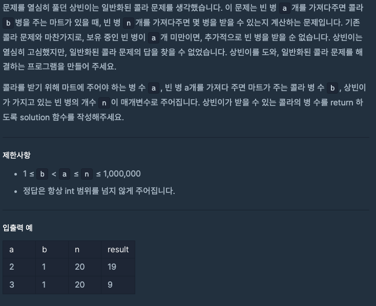 class Solution { public int solution(int a, int b, int n) { int answer = 0; while(n >= a) { int bottle = (n / a) * b; int remainder = n % a; answer += bottle; n = bottle + remainder; } return answer; } }마트에 콜라병을 가져갔을 때 받을 수 있는 병의 갯수(bottle)를 구하고, 가져가고 남은 갯수(remainder)를 구하여 값을 더 해주고 더 이상 나눌 수 없을 때 ( 콜라병을 받을 수 없는 ) 까지 반복하여 갯수를 구했습니다.