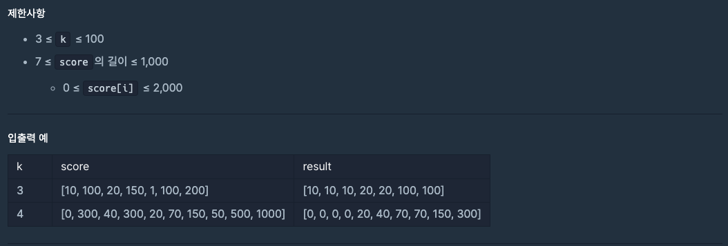 이 때, 큐의 크기가 k를 넘었다면 가장 낮은 점수(우선순위가 높은)을 제거 후 가장 낮은 점수를 반환하여 answer 배열에 값을 넣습니다.