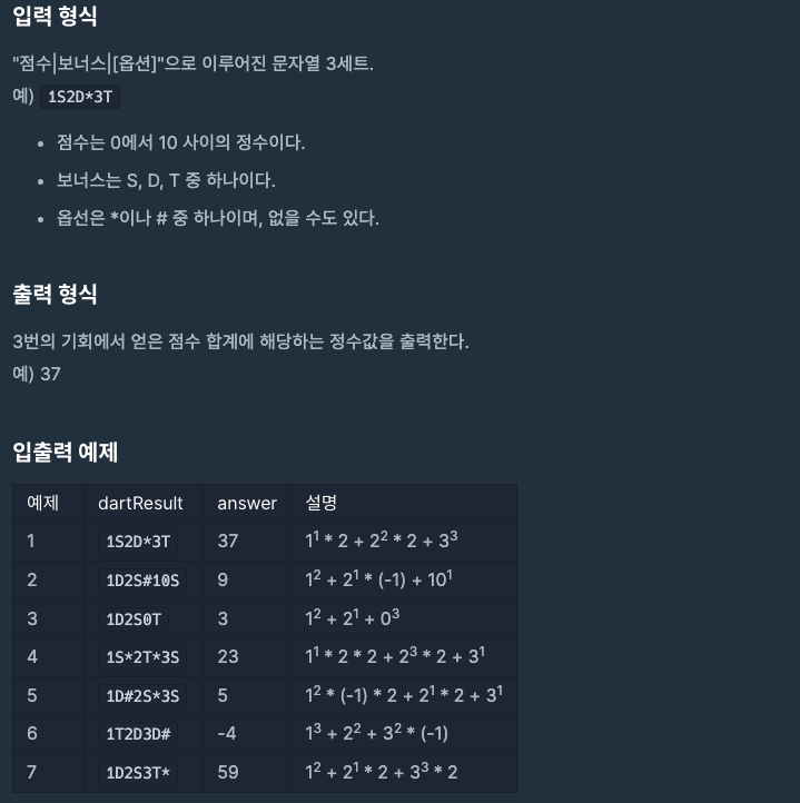 import java.util.*; class Solution { public int solution(String dartResult) { int answer = 0; List<Integer> scores = new ArrayList<>(); StringBuilder sb = new StringBuilder(); int score = 0; for(char c : dartResult.toCharArray()) { if(Character.isDigit(c)) { // 숫자일 때 점수 구하기 sb.append(c); } else if (c == 'S' || c == 'D'|| c == 'T') { // 영역에 따라 계산 score = Integer.parseInt(sb.toString()); sb = new StringBuilder(); // 기존 점수 초기화 if(c == 'S') scores.add(score); else if(c == 'D') scores.add((int) Math.pow(score, 2)); else scores.add((int) Math.pow(score, 3)); } else if (c == '*' || c == '#') { // 옵션 계산 if(scores.size() == 1) { // 첫 시도일 때 옵션 if(c == '*') scores.set(0, scores.get(0) * 2); else scores.set(0, -scores.get(0)); } else if(scores.size() > 1) { // 2, 3번째 시도일 때 옵션 if(c == '*') { scores.set(scores.size() - 1, scores.get(scores.size() - 1) * 2); scores.set(scores.size() - 2, scores.get(scores.size() - 2) * 2); } else { scores.set(scores.size() - 1, -scores.get(scores.size() - 1)); } } } } for(int n : scores) answer += n; return answer; } }문자열로 입력받기 때문에, 문자열을 toCharArray() 메소드를 이용해 각 문자로 나누어 숫자인지 판단하여 점수와 각 옵션과 영역을 구분했습니다.