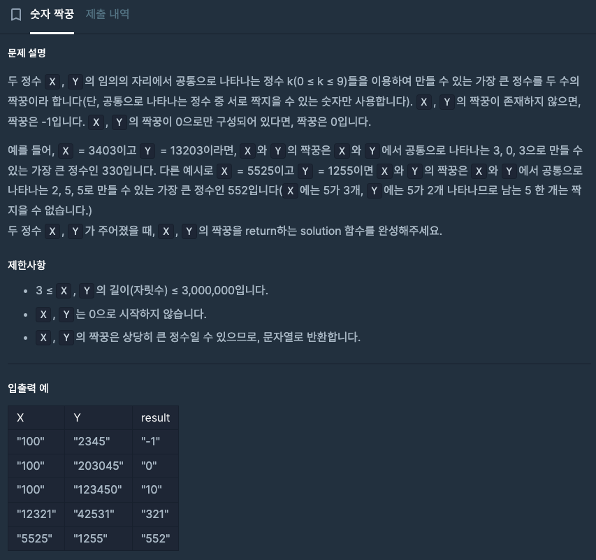import java.util.*; class Solution { public String solution(String X, String Y) { List<Character> listX = new ArrayList<>(); List<Character> listY = new ArrayList<>(); List<Integer> couple = new ArrayList<>(); StringBuilder sb = new StringBuilder(); for(char c : X.toCharArray()) listX.add(c); for(char c : Y.toCharArray()) listY.add(c); for(int i = 0; i < listX.size(); i++) { for(int j = 0; j < listY.size(); j++) { if(listX.get(i) == listY.get(j)) { couple.add(listY.get(j) - '0'); // 같은 짝꿍이 있다면, 짝궁 리스트에 추가 listY.remove(j); // 비교 리스트에서 삭제 } } } // 겹치는 수가 없을 때 if(couple.size() == 0) return "-1"; Collections.sort(couple); Collections.reverse(couple); // 내림차순으로 정렬 // 내림차순 정렬 후, 처음으로 오는 수가 0 일 때 -> 모든 수가 0 if(couple.get(0) == 0) return "0"; for(int c : couple) sb.append(c); return sb.toString(); } }문제를 처음 시도했을 때의 코드입니다.