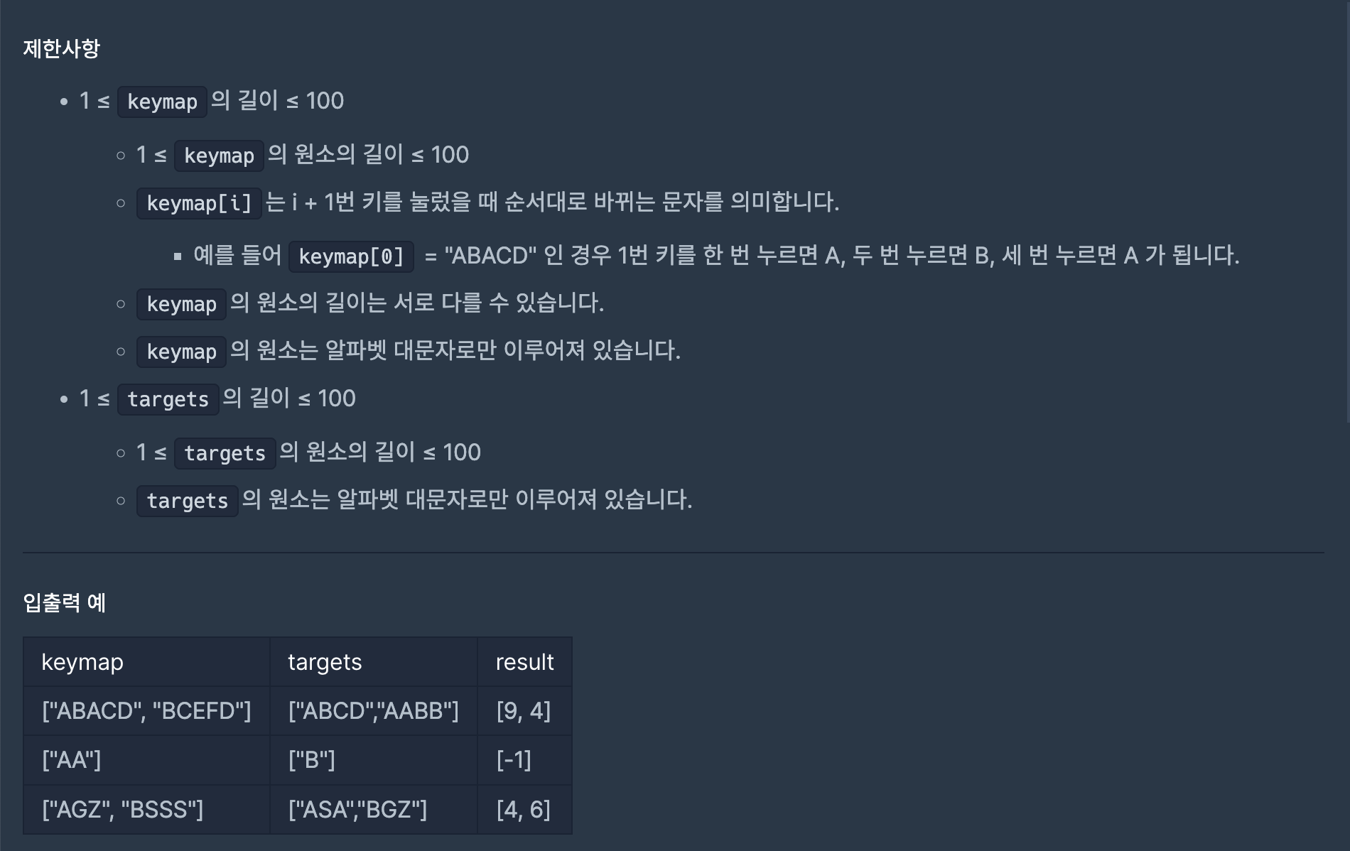 class Solution { public int[] solution(String[] keymap, String[] targets) { int[] answer = new int[targets.length]; for(int i = 0; i < targets.length; i++) { int sum = 0; // 누른 수 boolean check = false; // target의 단어가 keymap에 존재하는지 체크 for(char c : targets[i].toCharArray()) { int min = 101; // 각 targt의 char마다 최소 누른 수 for(String key : keymap) { for(int j = 0; j < key.length(); j++) { if(c == key.charAt(j)) { min = Math.min(min, j + 1); // j는 0 , 클릭은 1부터 시작 break; } } } if(min == 101) check = true; sum += min; } if(check) answer[i] = -1; else answer[i] = sum; } return answer; } }각 targes에서 각 문자열의 문자를 구하고, keymap에서 배열의 원소마다 비교하여 charAt을 이용해 최소 클릭 횟수를 구하여 sum에 더해 키를 누른 횟수를 구했습니다.